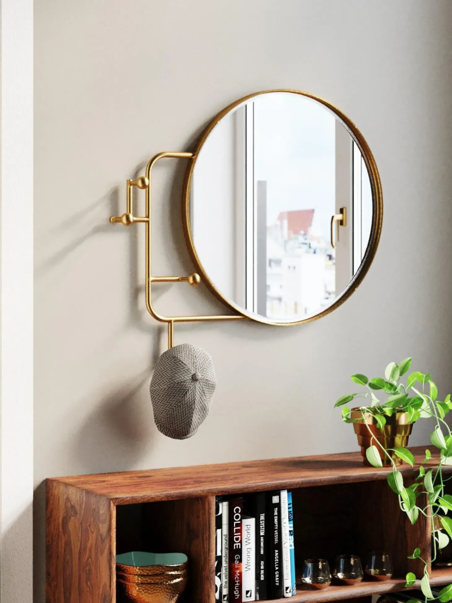 La Combinazione Di Pratici Ganci E Uno Specchio Rotondo Rende Questo Appendiabiti Da Ingresso Un Oggetto D’Arredo Funzionale E Di Stile.