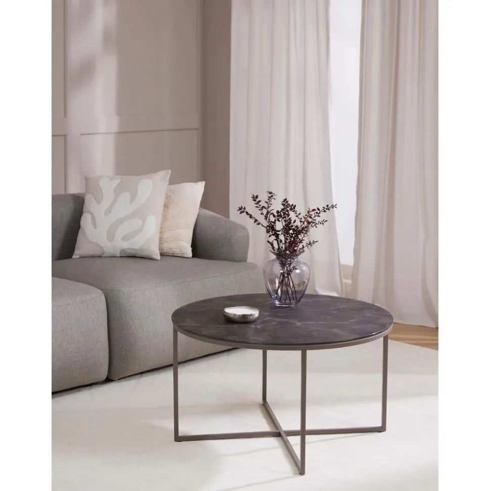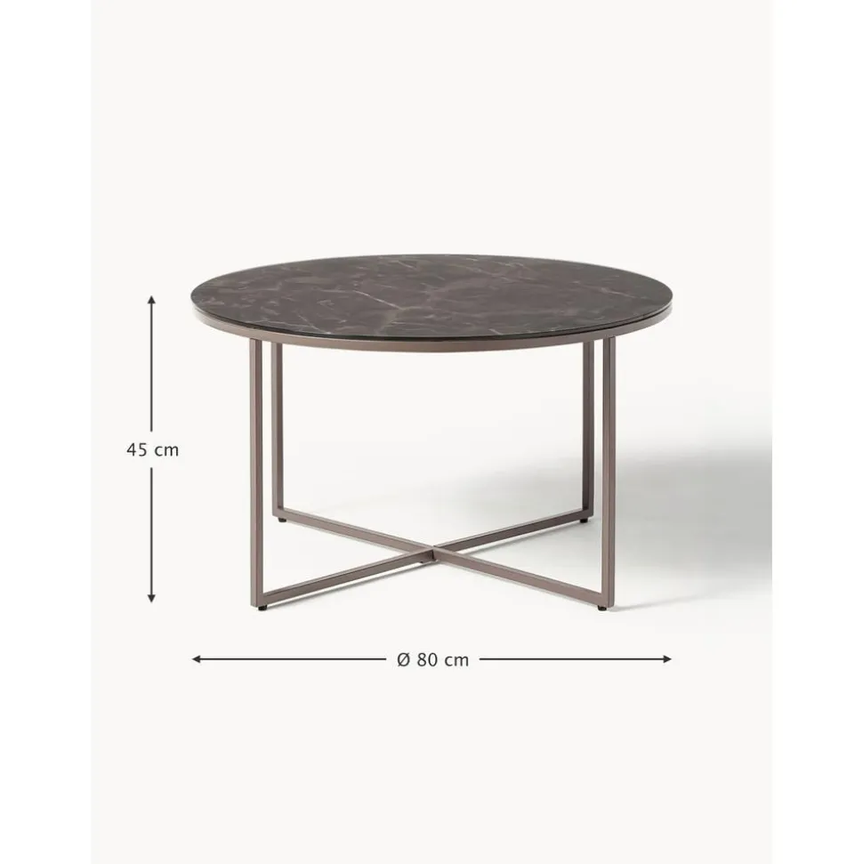 Tavolino Rotondo Da Salotto Con Piano In Vetro Effetto Marmo Antigua
